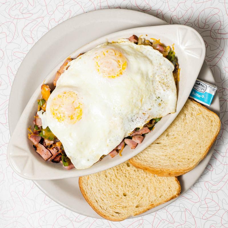 All served with your choice of toast - wheat, sourdough, rye, English muffin or biscuit • Pile - Over homefries & topped with two over medium eggs* | Hobo - Cooked all together with homefries & two eggs* | Omelette - Layered inside folded eggs* with side of homefries.